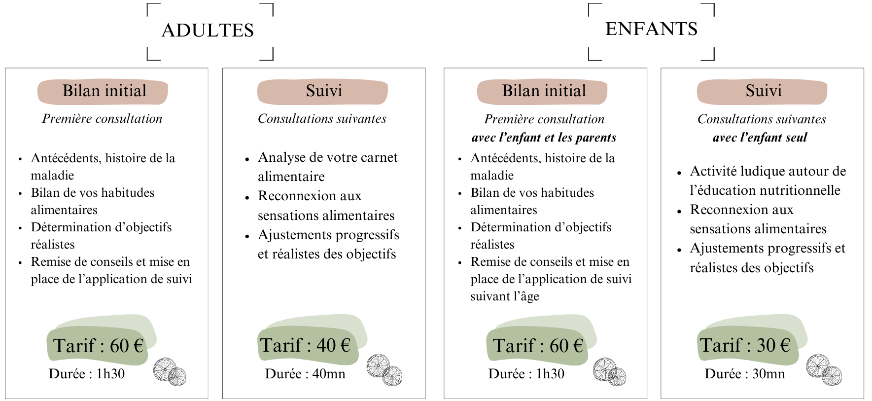 Tarif sur devis. Merci de me contacter par mail à l’adresse : contact@marinedogon-diet.fr. Pour en savoir plus sur les ateliers, merci de cliquer sur l’onglet « ATELIERS »